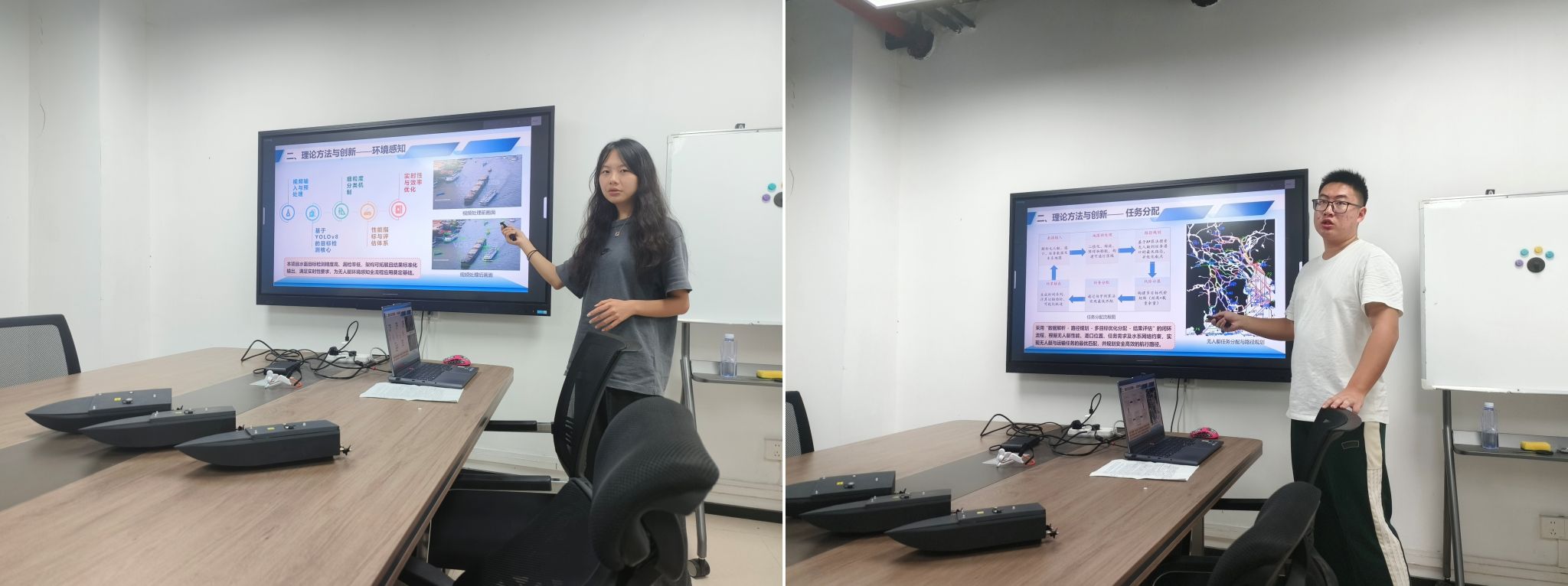 本次赛事,学校高度重视,校团委积极统筹协调,人工智能学院精准对接赛事需求,组建由陈子聪、向丹、刘芳(人工智能学院)3位教师指导,周瑜葳、宏栩沣、邓睿嵩、张子怡、谢东阳(人工智能学院)5位同学组成的攻关团队。备赛期间,团队依托“海洋物联网实验室”和“智能检测与感知工程中心”,反复迭代算法、优化硬件部署,并开展多轮仿真与实艇测试;指导教师全程跟进,从技术路线到答辩逻辑层层打磨,团队成员分工协作、昼夜奋战,百余天的攻坚最终换来终审现场的从容自信与技术硬核。