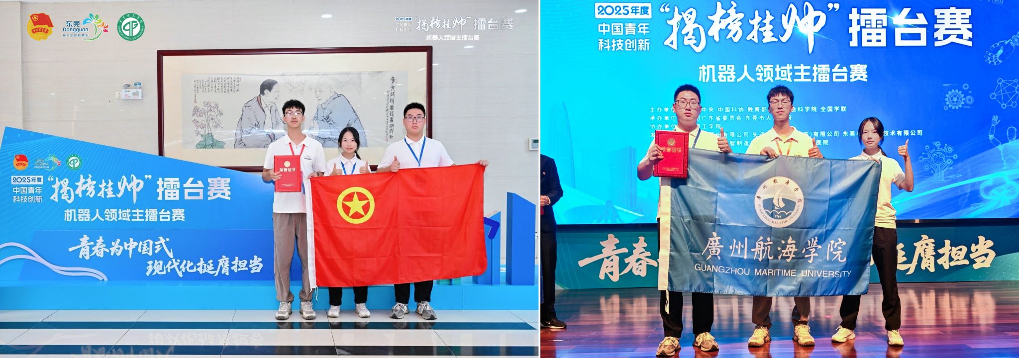 本届“揭榜挂帅”擂台赛机器人领域主擂台赛由共青团中央、中国科协、教育部、中国社会科学院、全国学联联合主办,共青团广东省委与东莞市人民政府承办,东莞理工学院协办,聚焦机器人领域“真问题、真需求、真攻关”,共发布五大核心榜题,设立学生组与青年科技人才组双赛道。赛事吸引了包括清华大学、哈尔滨工业大学、华中科技大学等在内的67所高校及企业单位,共计151支队伍参与。经过严格初审,95支队伍晋级终审现场擂台。广航院团队迎难而上,在强手如林的竞技场中沉着应战,以扎实的技术方案和出色的现场表现赢得评委高度认可。