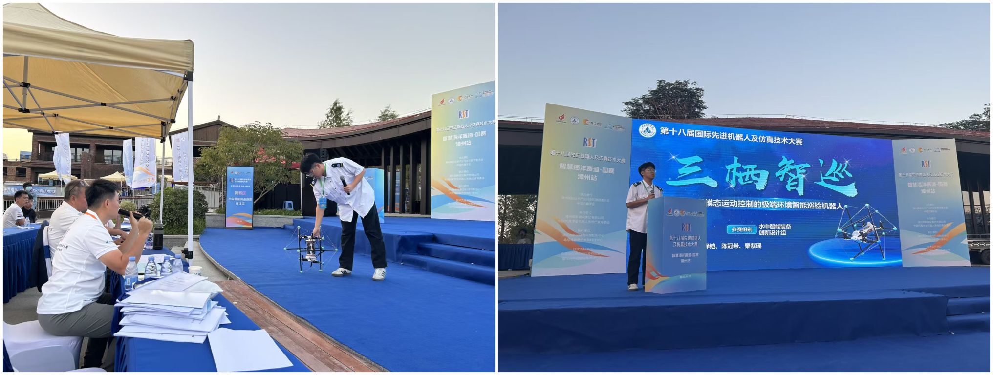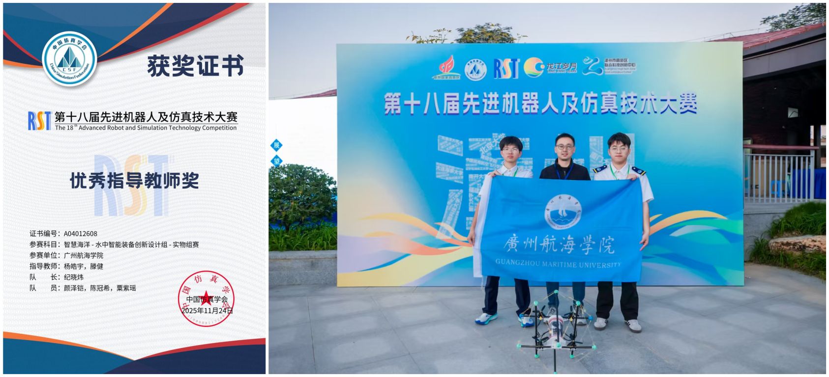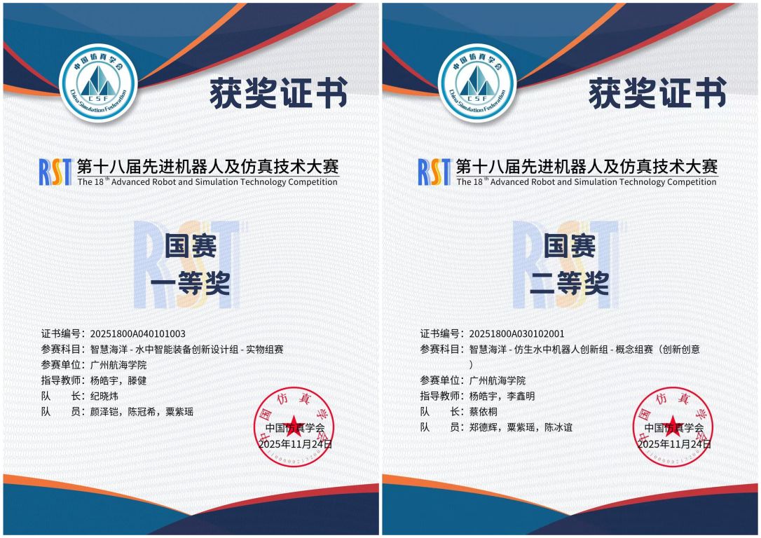 11月15日,由中国仿真学会、国际水中机器人联盟联合主办的“第十八届国际先进机器人及仿真技术大赛(RST)·智慧海洋赛道”全国总决赛在福建漳州圆满落幕。广州航海学院张拉结构实验室团队凭借两项创新成果脱颖而出,一举斩获实物组全国一等奖(季军)、概念组全国二等奖,指导教师杨皓宇、滕健获评 “优秀指导教师奖”。中央电视台 CCTV-4中文国际频道《中国新闻》对赛事进行全程跟踪报道,对广航院“三栖智巡”机器人样机特写播出,称赞该技术创新与工程应用价值。